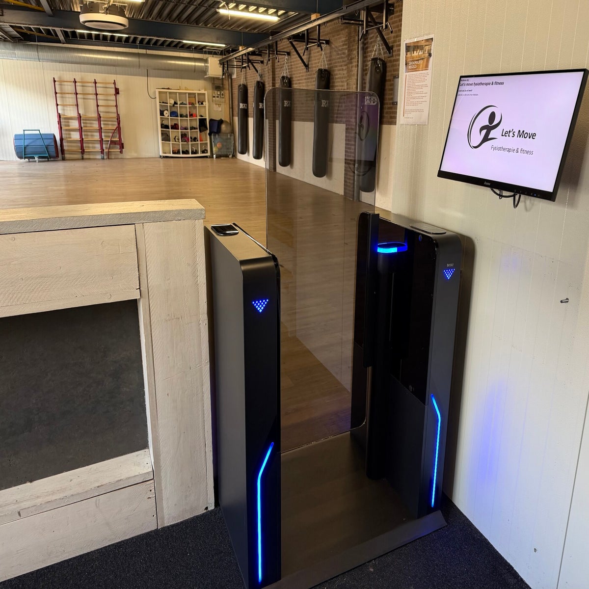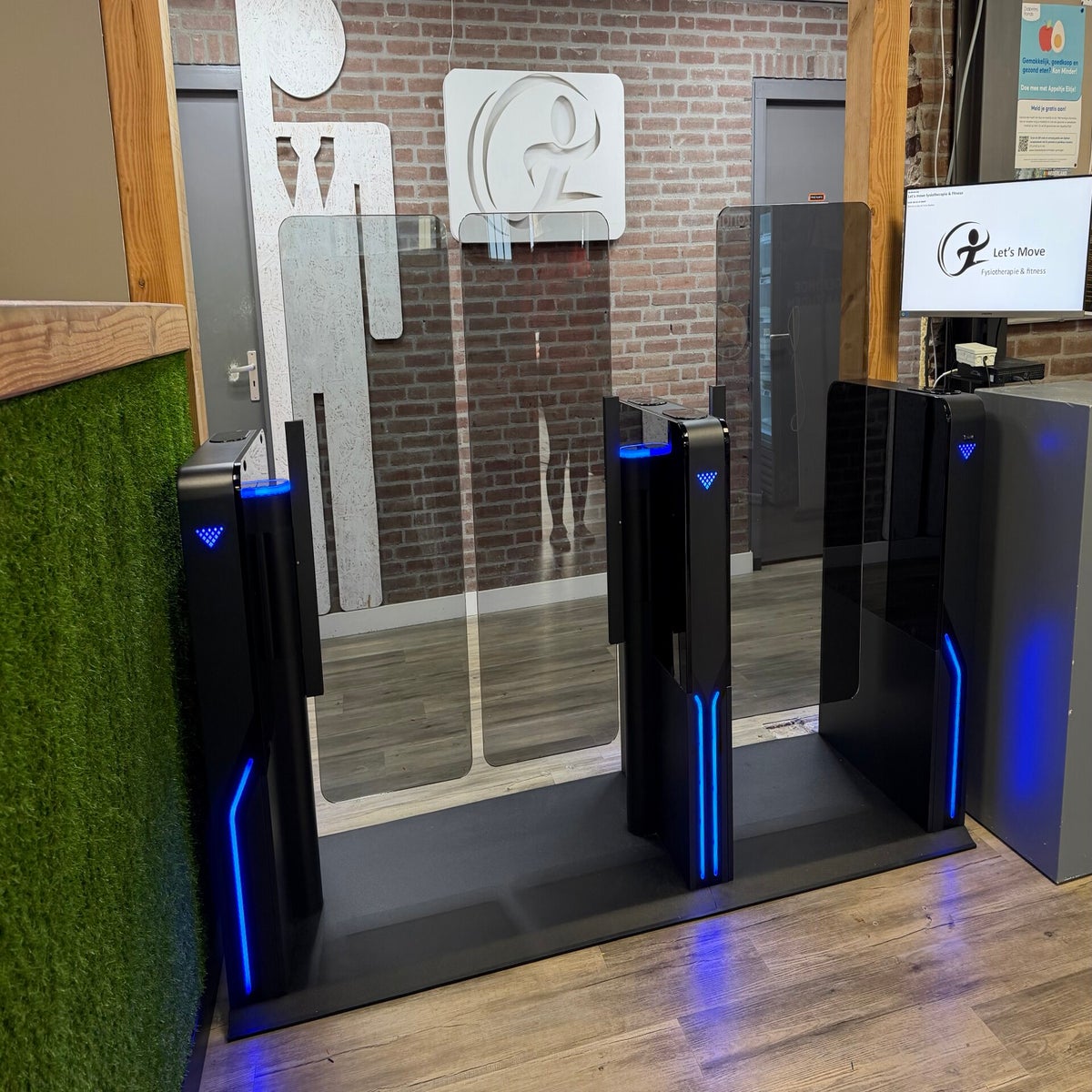 Let's Move is van origine een grote fysiotherapie-praktijk maar heeft inmiddels een grote sportafdeling. In het ene pand is een aparte groepsruimte gevestigd en daar hebben we een Force 1 geplaatst. In het hoofdgebouw is een Force 3 geplaatst, ook op een vloerplaat. Fitness leden checken in het gedeelte met 55 cm doorgang. Het gedeelte met 90 cm doorgang wordt gebruikt voor alle cliënten met rolstoel, krukken, rollators enz.