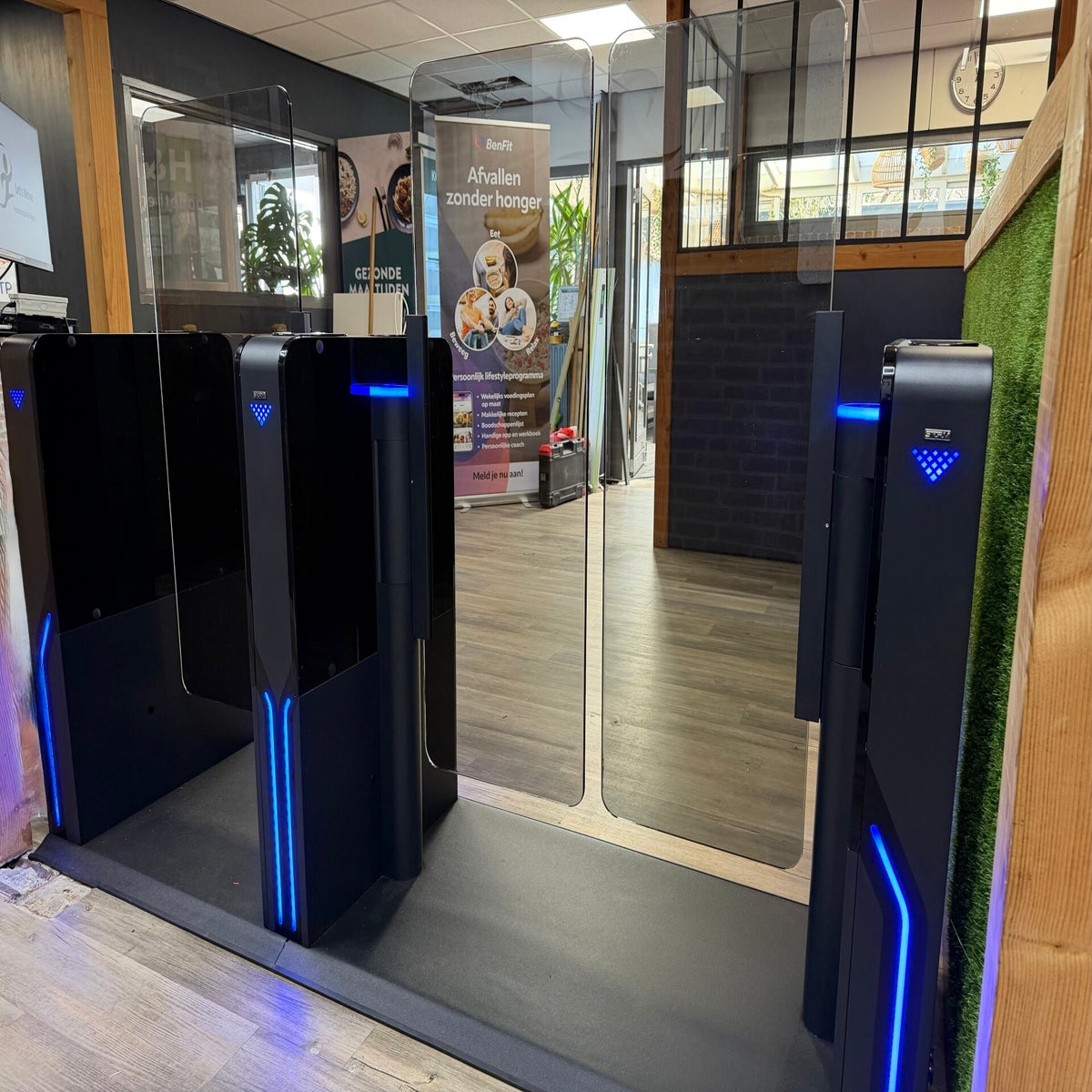 Wellactief is recent verhuisd naar een mooie nieuwe locatie in het centrum van Lunteren. Linda en Paul hebben er een prachtige club van gemaakt en wij hebben de entree afgemaakt met de plaatsing van een Force 3. Die bestaat uit een Force 2 met 90 cm doorgang en lage deuren voor de ingang. Klanten gaan naar buiten via het gedeelte met 55 cm doorgang. Leveranciers en rolstoelen kunnen door de Force 2 naar buiten. In-en uitgang gecontroleerd via een RFID en QR lezer.