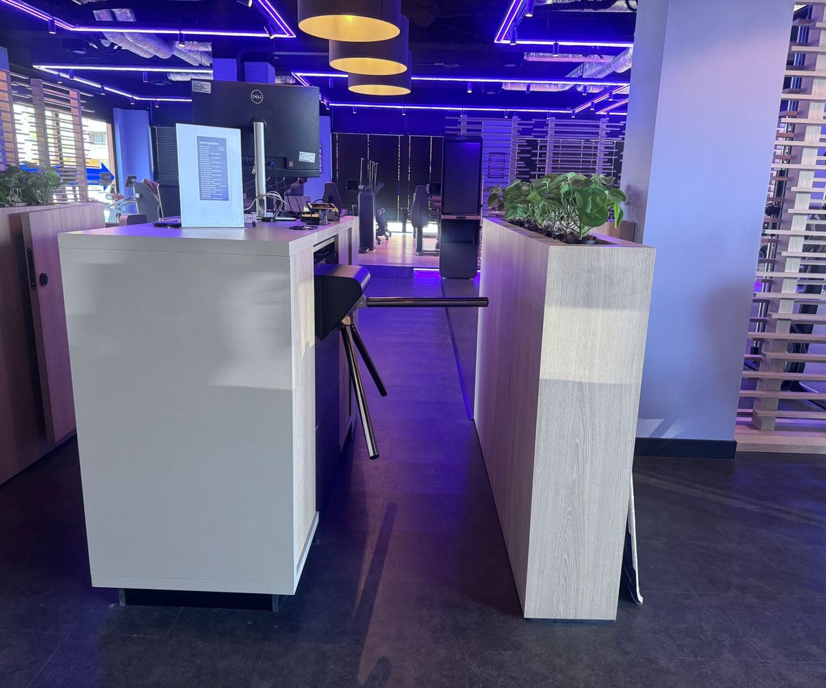 De bestaande tourniquet is vervangen door een Full-Size tourniquet uit de Design Series. We hebben de NFC lezer ingebouwd en voor de uitgang drukken de leden eerst op de rode knop. Dit laatste om te voorkomen dat leden zich toegang kunnen verlenen door aan kant van de ingang de arm van de tourniquet naar zich toe te trekken. De monitor op de balie geeft informatie aan de leden zodra ze hun Tag bij de lezer houden. De open ruimte wordt nog opgevuld met een plantenbak.