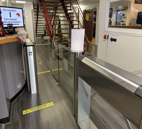 De bestaande tourniquet is vervangen door een Full-Size tourniquet uit de Design Series. We hebben de NFC lezer ingebouwd en voor de uitgang drukken de leden eerst op de rode knop. Dit laatste om te voorkomen dat leden zich toegang kunnen verlenen door aan kant van de ingang de arm van de tourniquet naar zich toe te trekken. De monitor op de balie geeft informatie aan de leden zodra ze hun Tag bij de lezer houden. De open ruimte wordt nog opgevuld met een plantenbak.