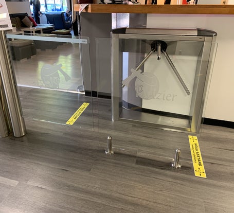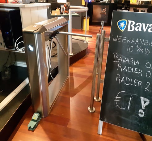 We hebben een full-size tourniquet geplaatst. Nieuw: ipv een vrije uitgang of druk op een knop hebben we een voetpedaal geplaatst en dat werkt perfect. Leden kunnen zo snel naar buiten maar het pedaal is niet te bereiken voor leden die hun pas vergeten zijn aan de voorkant van de tourniquet.