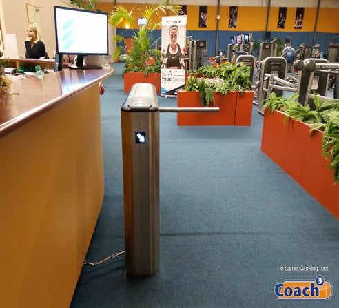 We hebben de kaartlezer van Coach ingebouwd en voor de uitgang drukken de leden eerst op de rode knop. Dit laatste om te voorkomen dat leden zich toegang kunnen verlenen door aan kant van de ingang de arm van de tourniquet naar zich toe te trekken. De monitor boven de tourniquet geeft informatie aan de leden zodra ze hun Tag bij de lezer houden. Opmerking: inmiddels is dit centrum overgestapt naar Dewi maar ook hun lezers functioneren natuurlijk weer prima.