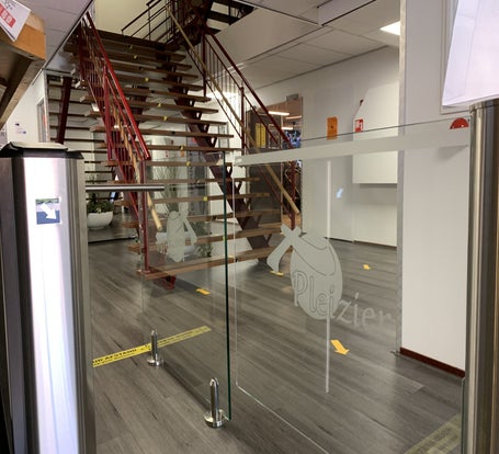 Het geheel is afgemaakt met een fraai hekwerk, het glazen paneel en de glazen deur zijn door ons voorzien van het logo van het sportcentrum.