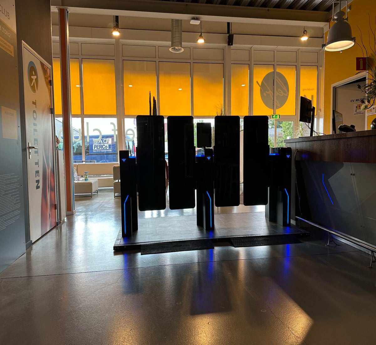 Aarts Sports in Lisse is van oudsher al een prachtig centrum. We hebben de bestaande tourniquets vervangen voor onze Force 1 Max. Die past precies in de doorgang naar de receptie. 1 poort wordt gebruikt voor ingaande registratie en de andere voor vrije uitgang. De rfid lezer van Virtuagym is ingebouwd en aangesloten. Alles is op onze vloerplaat gemonteerd waar alle bekabeling in is verwerkt.