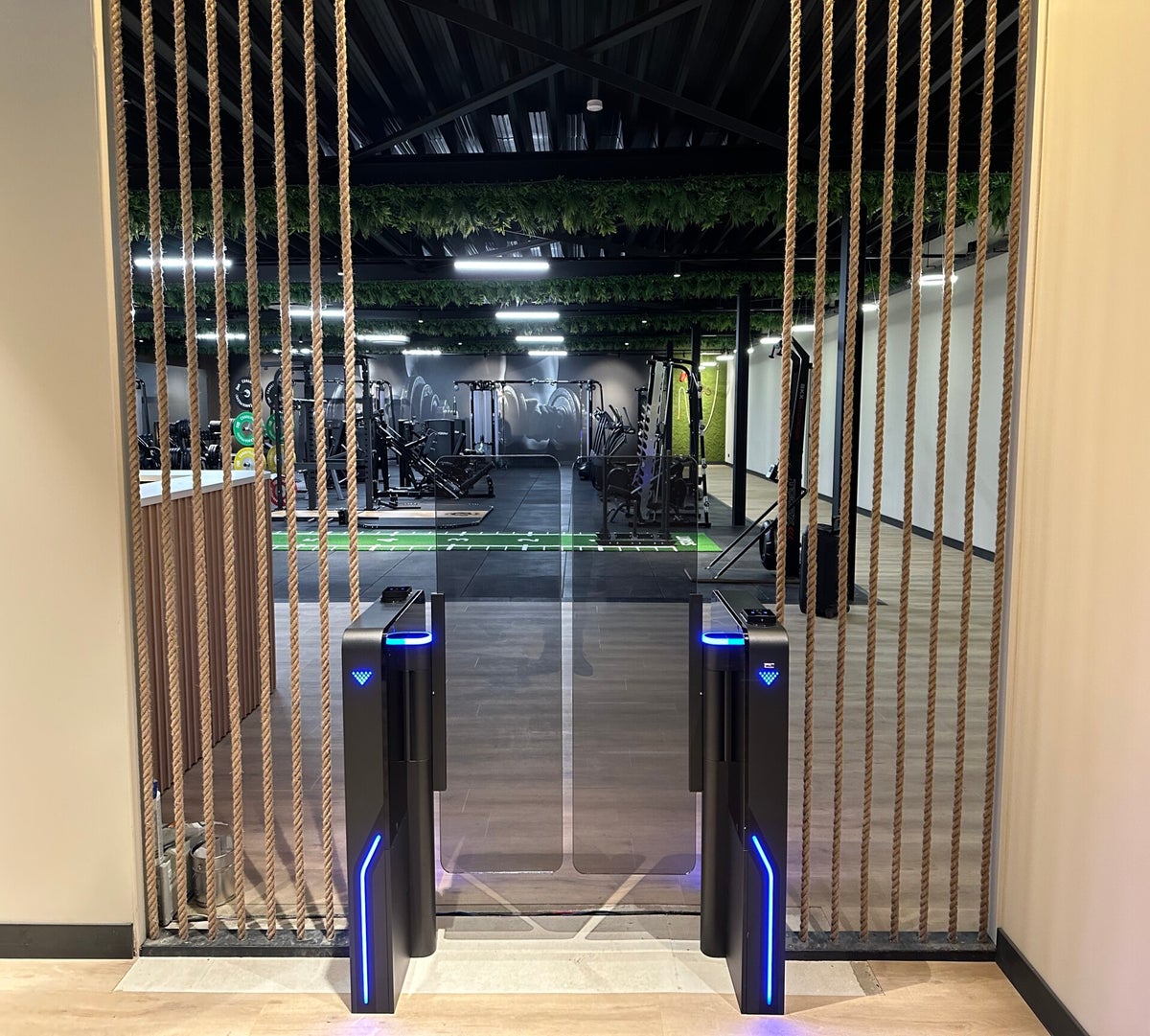We hebben de bestaande tourniquet vervangen voor een Force 1 Max die precies past in de open ruimte die naar de fitnesszaal leidt. Ingang door linker poort, gecontroleerd door de barcodescanner die we op de muur hebben gemonteerd, uitgang vrij via de poort aan de rechterkant.