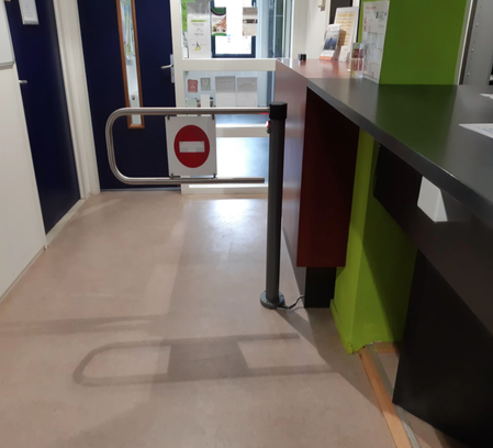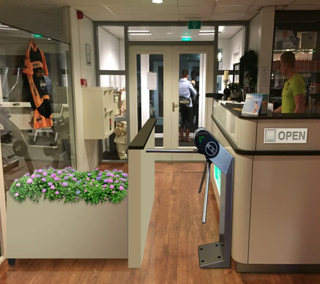 We hebben Full Size tourniquets geplaatst uit de design Series 1 voor de ingang en 1 voor de uitgang. De zwenkpoort met glazen deur wordt gebruikt voor mindervaliden, kinderwagens en bezoekers voor de fysiotherapie. Personeel kan vanachter de balie alle poorten bedienen met onze afstandsbedieningen.