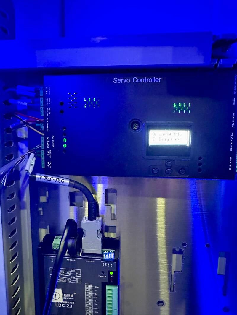 Om de controller-unit te bereiken moet de bovenste zwarte plaat aan de binnenkant verwijderd worden. Verwijder de 4 kunststof afdek-kapjes en de 4 inbusbouten, dan kan vervolgens de plaat naar boven geschoven worden. De Servo Controller is meteen zichtbaar.